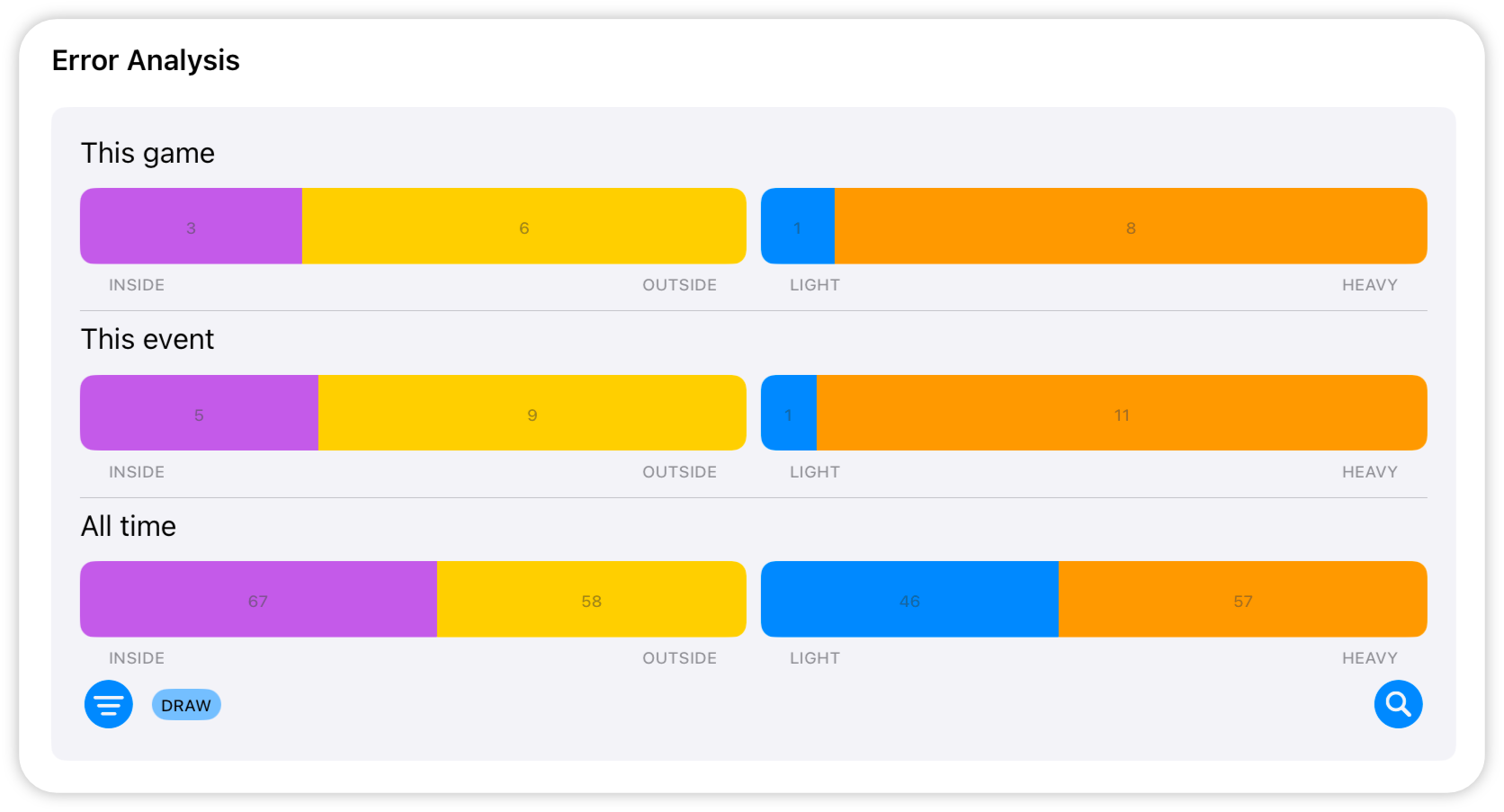 - Errors are the way a shot is missed (heavy, light, inside, outside)