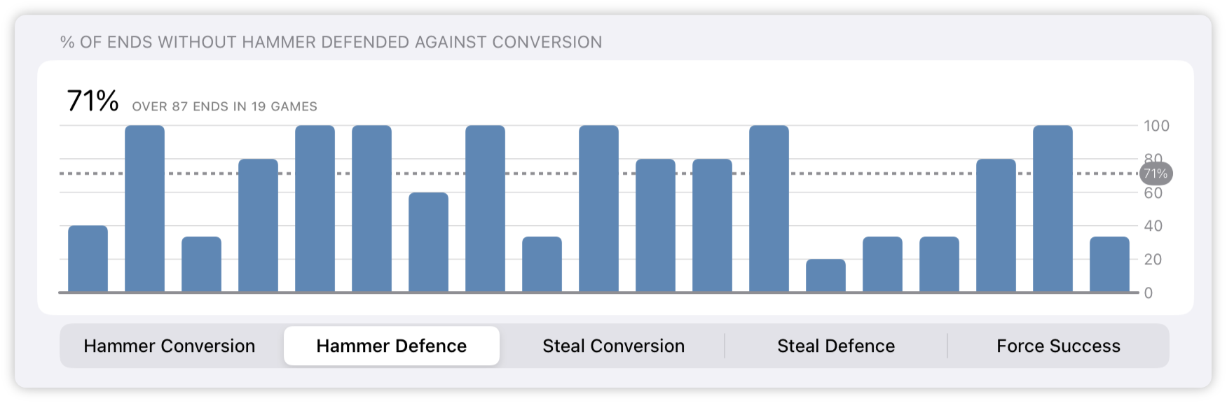 Performance timeline bar charts highlight misses, and make trends obvious at a glance. No more digging through shot scores to uncover meaning. It’s seriously the best way to review a curling game.
