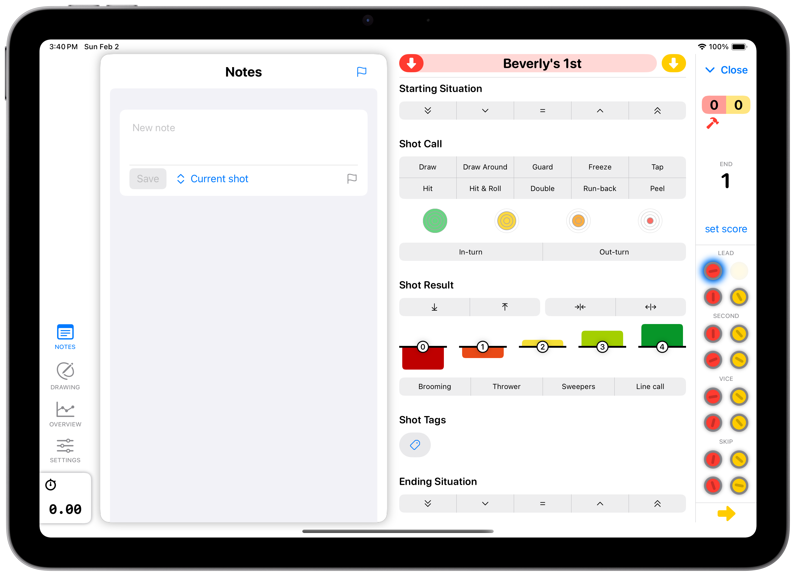During a game, instant note capture is always at your fingertips. More than just a thought, CurlBook saves the context of each note when you create it. Whether it’s the current shot, end, or game; either team; or a player, your note will always have the context it needs to be useful.