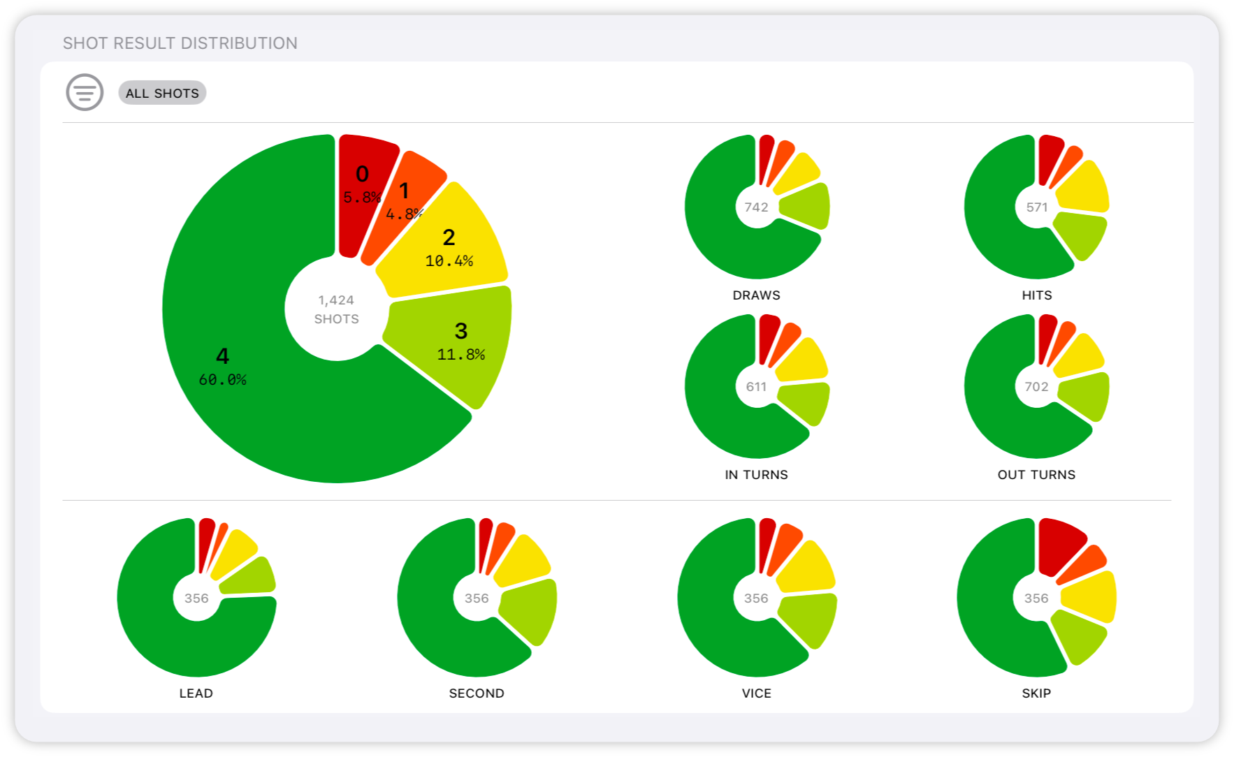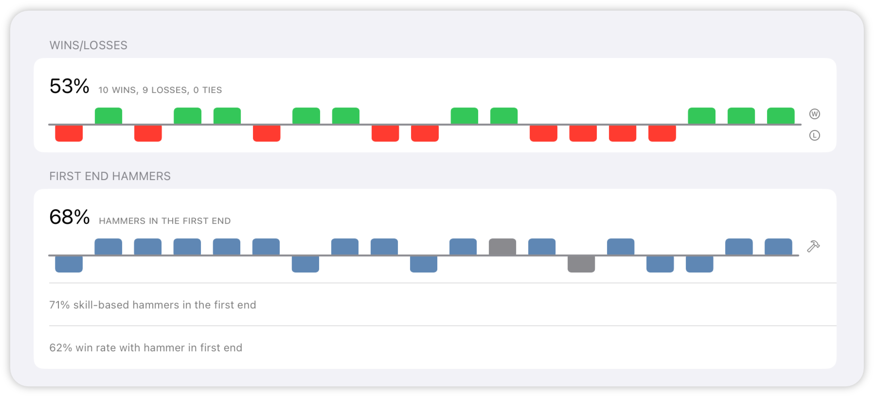 A game in isolation is important, but trends over the season are what really matter. See your results at a glance, dive deeper into your scoreboard and first-hammer performance, look for tendencies over all of your games and shots.